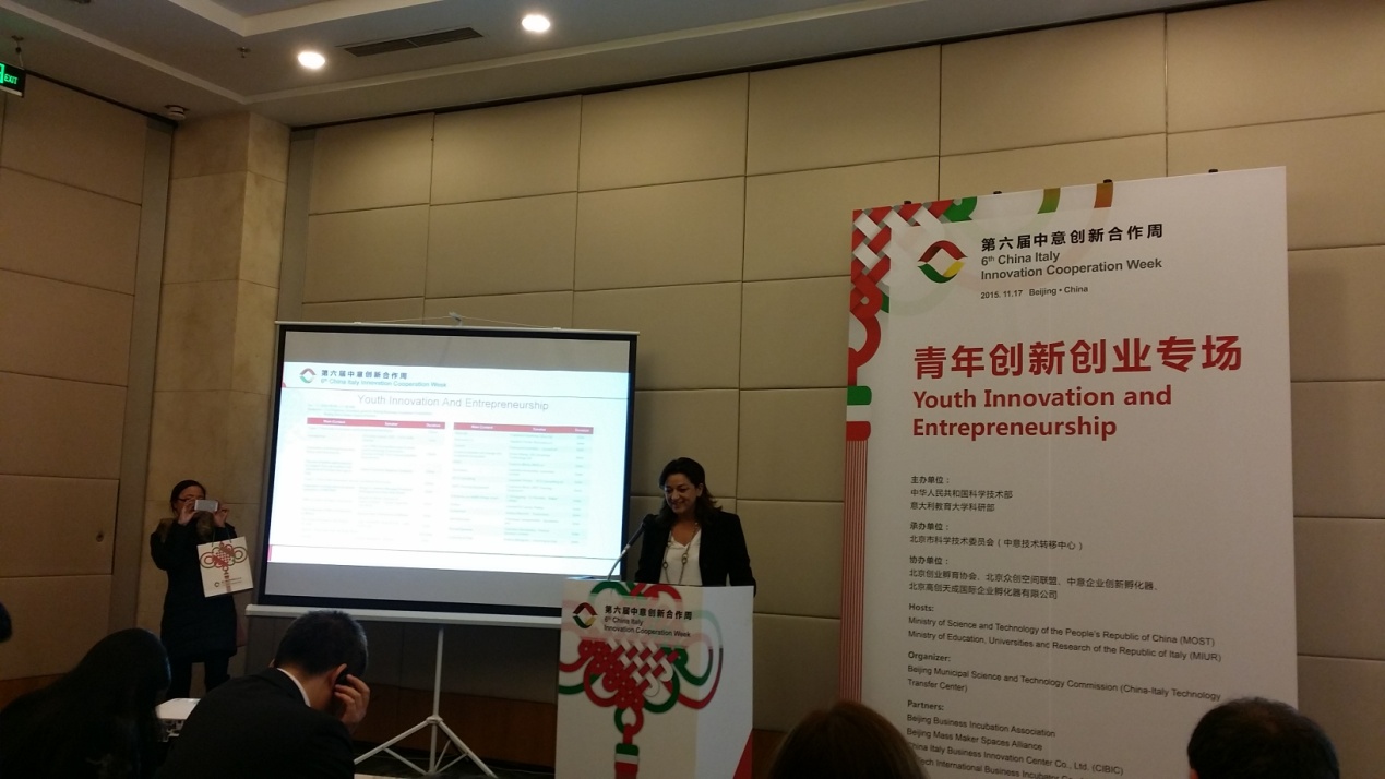 由中华人民共和国科学技术部和意大利教育大学科研部主办,北京创业孵育协会、北京众创空间联盟、中意企业创新孵化器、北京高创天成国际企业孵化器有限公司在北京市科委的支持与指导下共同承办的第六届中意创新合作周——青年创新创业专场于2015年11月17日上午在北京国际会议中心5D会议室成功召开。