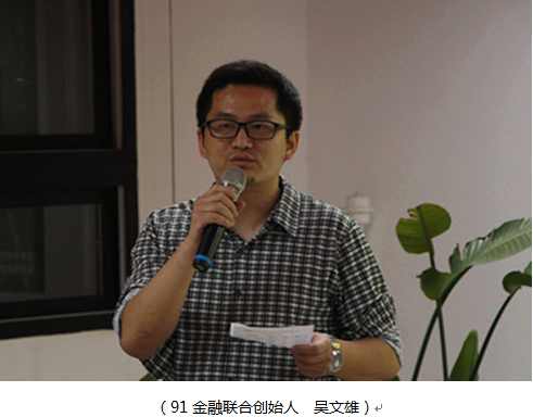 作为首期会议轮值主持,91金融联合创始人吴文雄表示,互联网金融处于上升发展阶段,不管是P2P、第三方支付还是众筹,都存在诸多不足,相互之间也存在很多联系,大家需要多交流学习,抱团取暖才能解决困难,最终迎来整个行业的春天。他在这次交流会中提出“P2P监管的底线思维在哪儿”、“互联网金融本质上推高了哪些行业成本”两个议题,引发了与会嘉宾的热烈讨论。