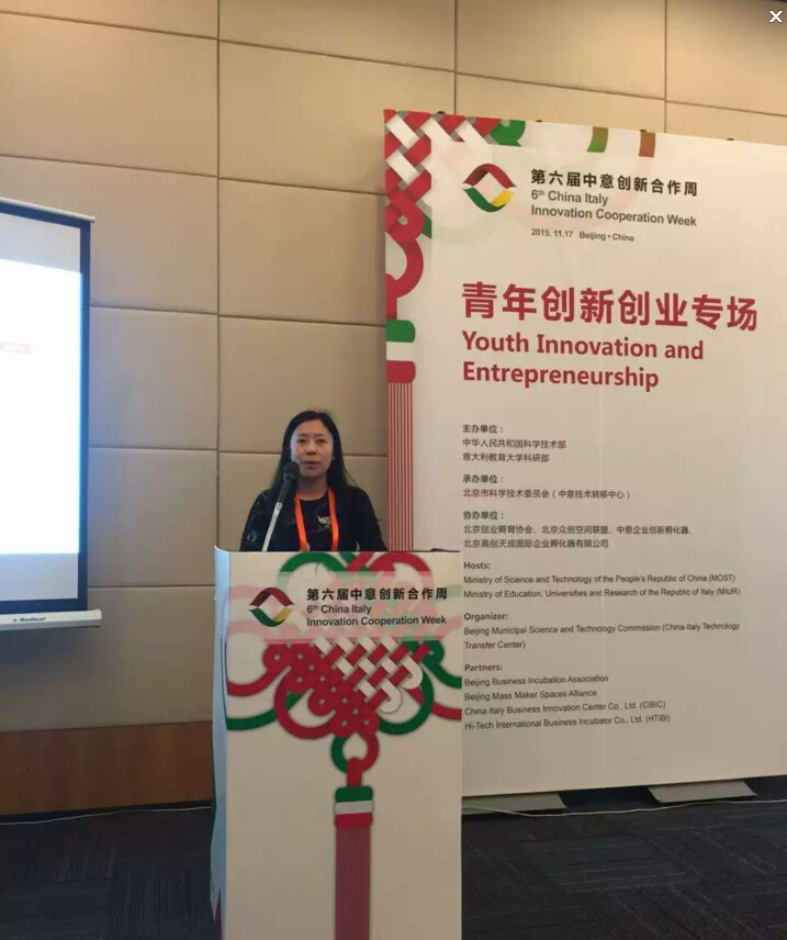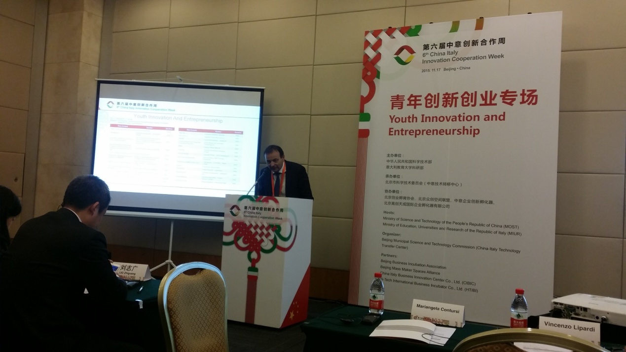 由中华人民共和国科学技术部和意大利教育大学科研部主办,北京创业孵育协会、北京众创空间联盟、中意企业创新孵化器、北京高创天成国际企业孵化器有限公司在北京市科委的支持与指导下共同承办的第六届中意创新合作周——青年创新创业专场于2015年11月17日上午在北京国际会议中心5D会议室成功召开。