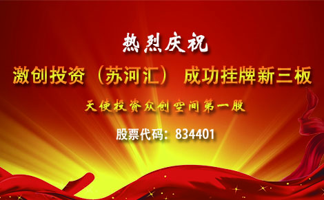 苏河汇(激创投资)是中国众创空间、天使投资第一股,于2015年11月20日正式挂牌新三板,股票代码为:834401.旗下品牌苏河汇,是北京众创空间联盟成员和知名的天使投资机构。