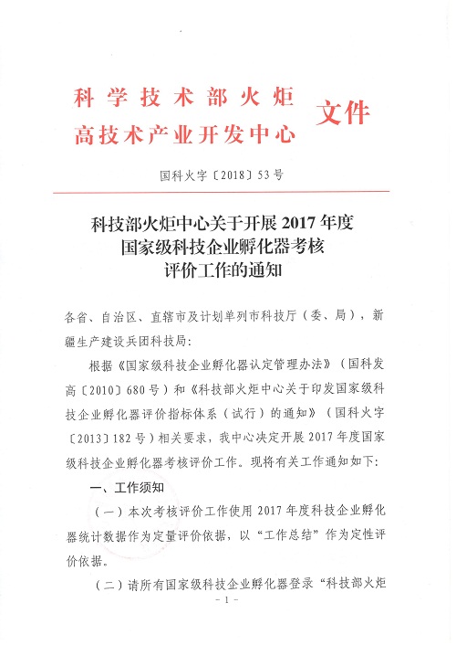 转发《科技部火炬中心关于开展2017年度国家级科技企业孵化器考核评价工作的通知》